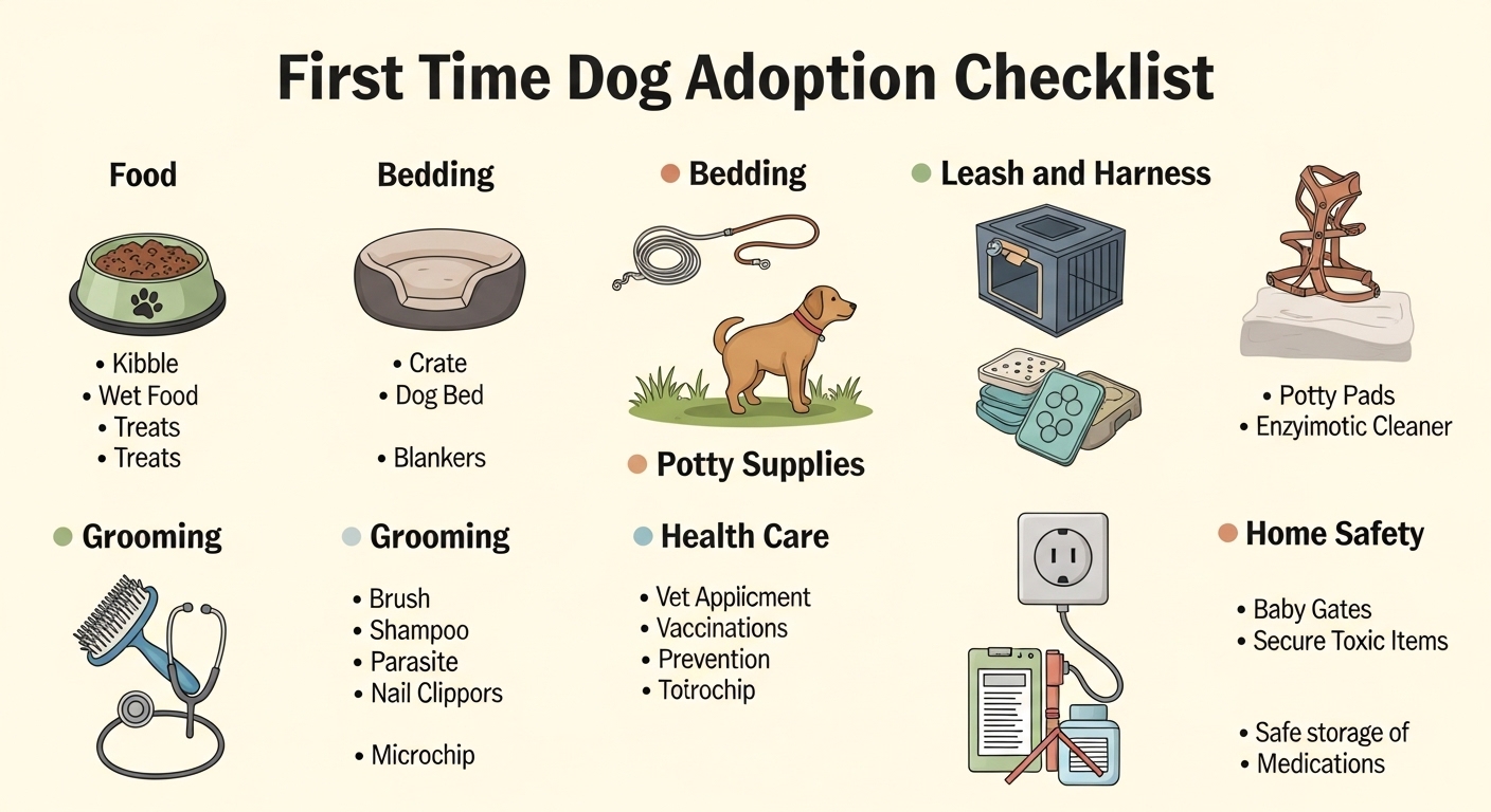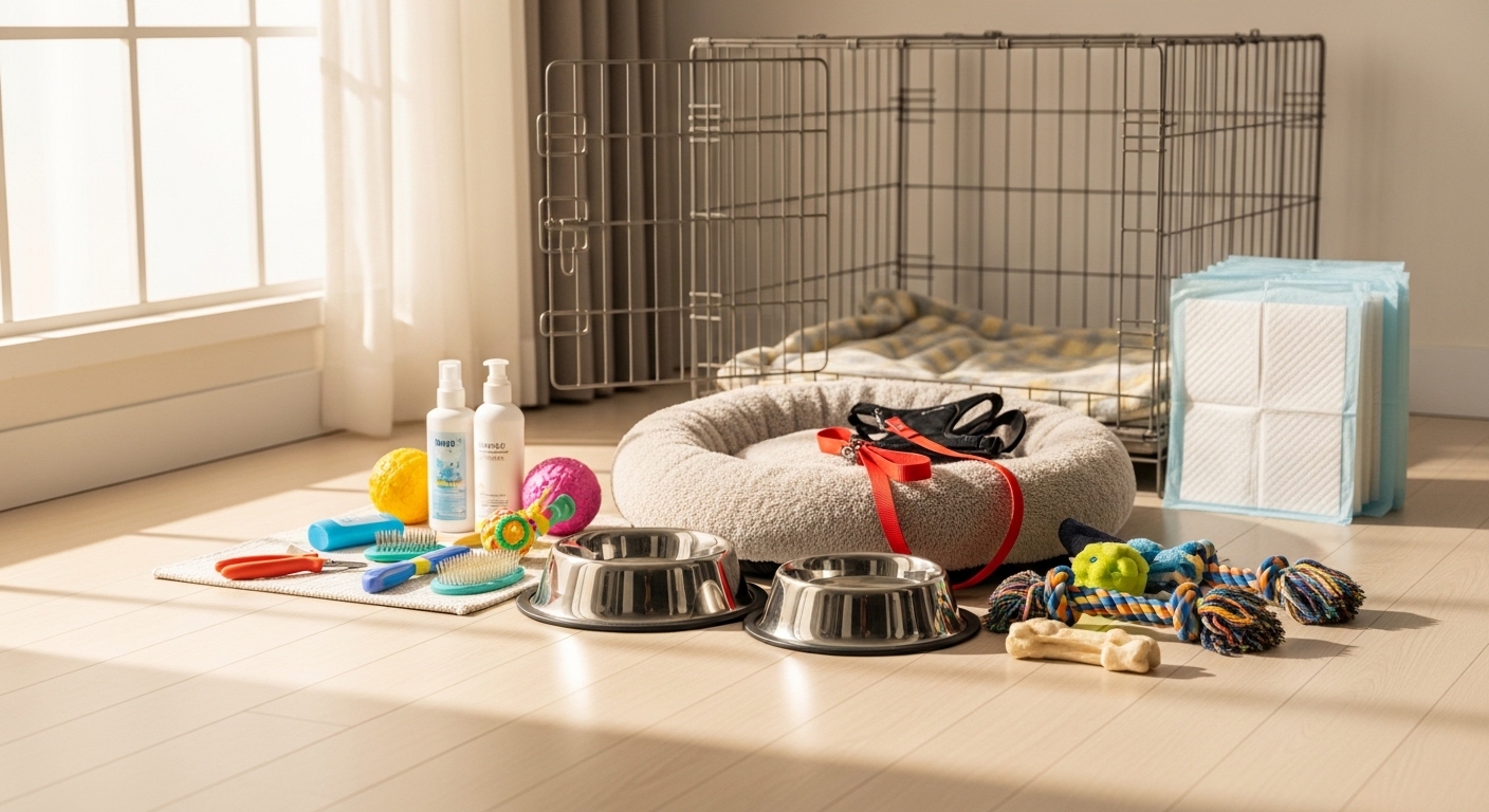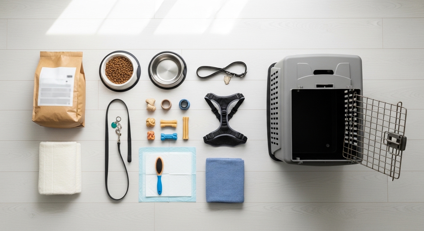 초보 보호자 입양 전 준비물 체크리스트에서 가장 먼저 챙길 것은 사료, 물그릇, 밥그릇, 잠자리, 목걸이 또는 하네스, 리드줄, 배변용품입니다. ASPCA는 반려견 기본 용품으로 프리미엄 사료와 간식, 식기, 장난감, 빗, 목걸이와 ID 태그, 리드줄, 이동장, 훈련용 크레이트, 침구, 반려견 칫솔을 제시하고 있습니다. AKC도 새 강아지를 맞이할 때 하네스, 리드줄, 잠자리, 씹을 장난감, 배변 훈련 관련 준비를 기본 장비로 안내합니다. 이 항목들은 첫날부터 바로 필요할 가능성이 높기 때문에 우선순위가 가장 높습니다.