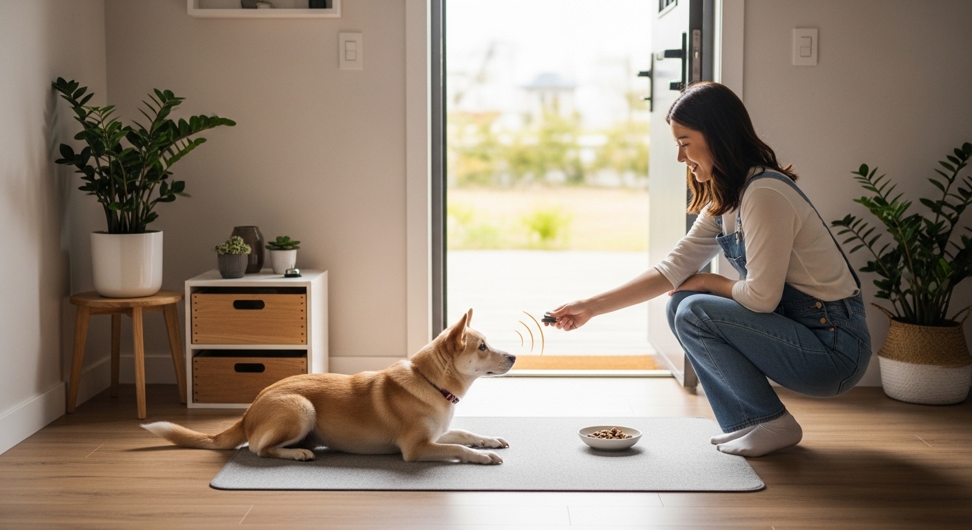 가장 먼저 필요한 것은 강아지가 이동할 ‘자리’ 하나를 정하는 것입니다. 이 자리는 문에서 너무 가깝지 않고, 강아지가 쉬기 편하고, 반복적으로 보상하기 쉬운 매트·방석·크레이트 앞 공간이면 좋습니다. VCA는 초인종 훈련에서 대체 행동으로 “place”를 먼저 가르치라고 설명하며, 이 행동은 문으로 돌진하는 행동과 양립하기 어렵기 때문에 효과적이라고 안내합니다.